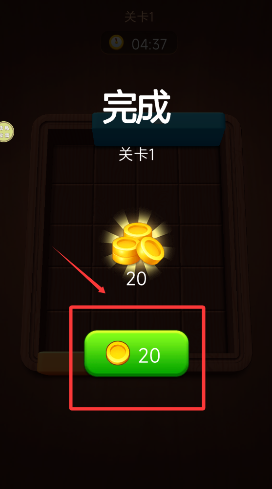 4、通關(guān)完成后有20金幣獎勵點擊按鈕領(lǐng)取。