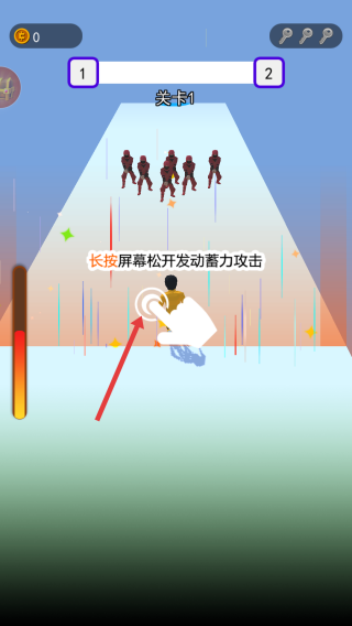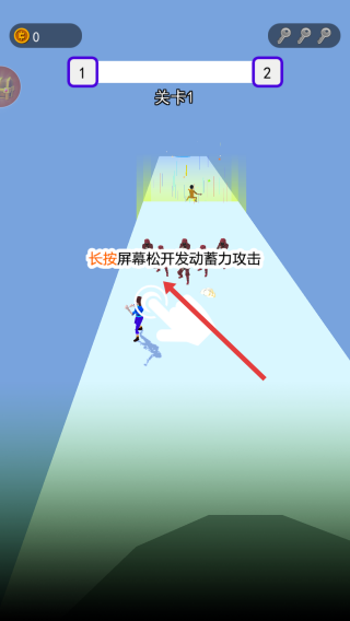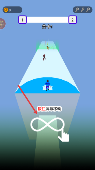 1、關(guān)卡1,按住屏幕拖動,控制藍色角色左右移動,躲避障礙、接近敵人。