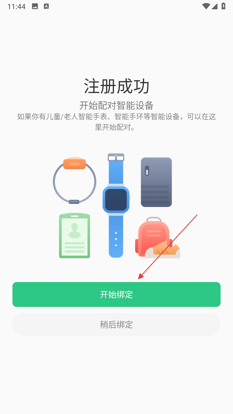 1、打開安全守護(hù)應(yīng)用,完成賬號注冊并登錄,注冊成功后點(diǎn)擊頁面中的開始綁定按鈕,進(jìn)入選擇設(shè)備類型的頁面。