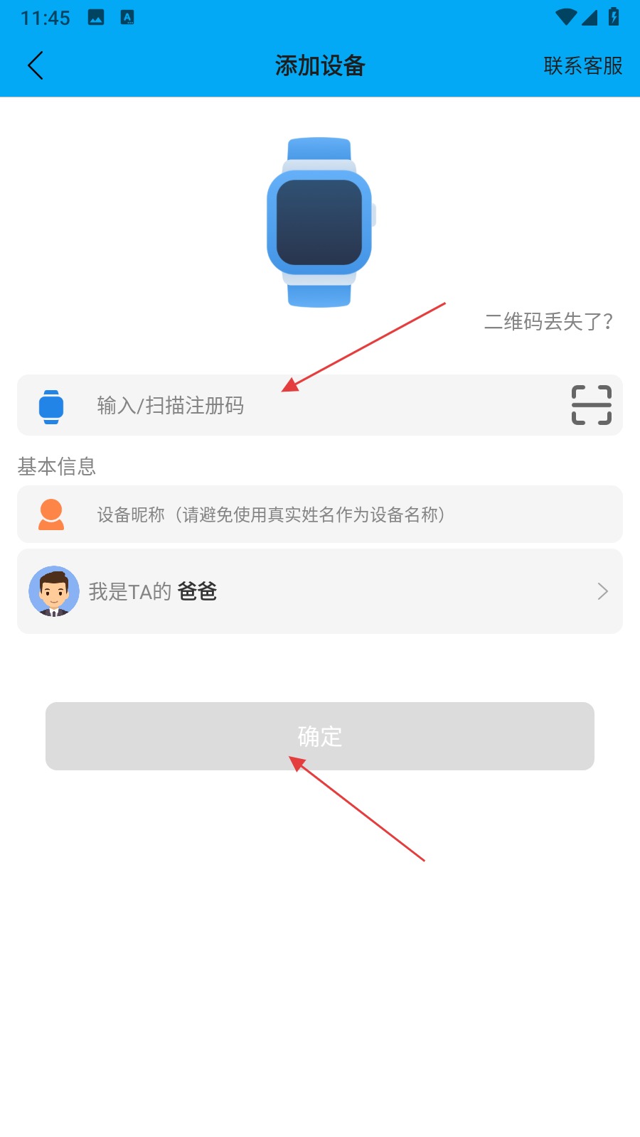 3、在添加設(shè)備頁面,點(diǎn)擊輸入或掃描注冊碼的輸入欄,輸入電話手表機(jī)身上的注冊碼,接著設(shè)置設(shè)備昵稱,選擇與設(shè)備使用者的關(guān)系,最后點(diǎn)擊確定按鈕完成綁定。