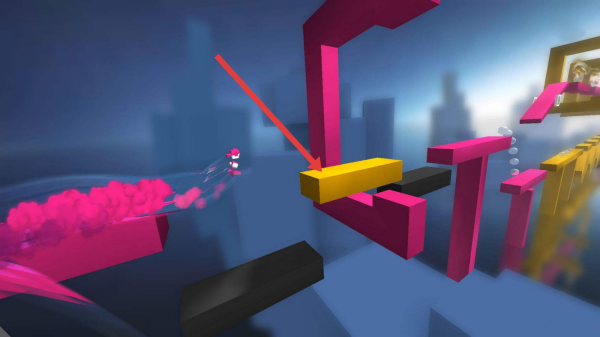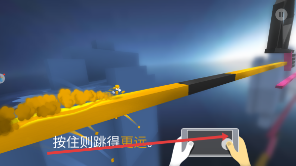 2、在黃色跑道段,依據(jù)提示來(lái)操作,按住則跳得更遠(yuǎn),長(zhǎng)按屏幕控制跳躍距離,跨越長(zhǎng)間隔黑色的障礙。