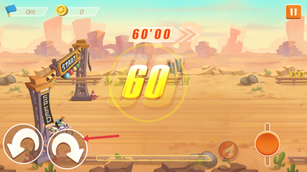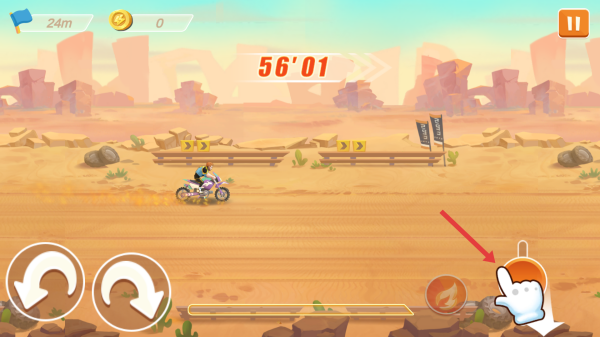 2、在沙漠賽道,用左側(cè)轉(zhuǎn)向按鍵控摩托平衡、方向,右側(cè)按鍵控制加速、特技動作。