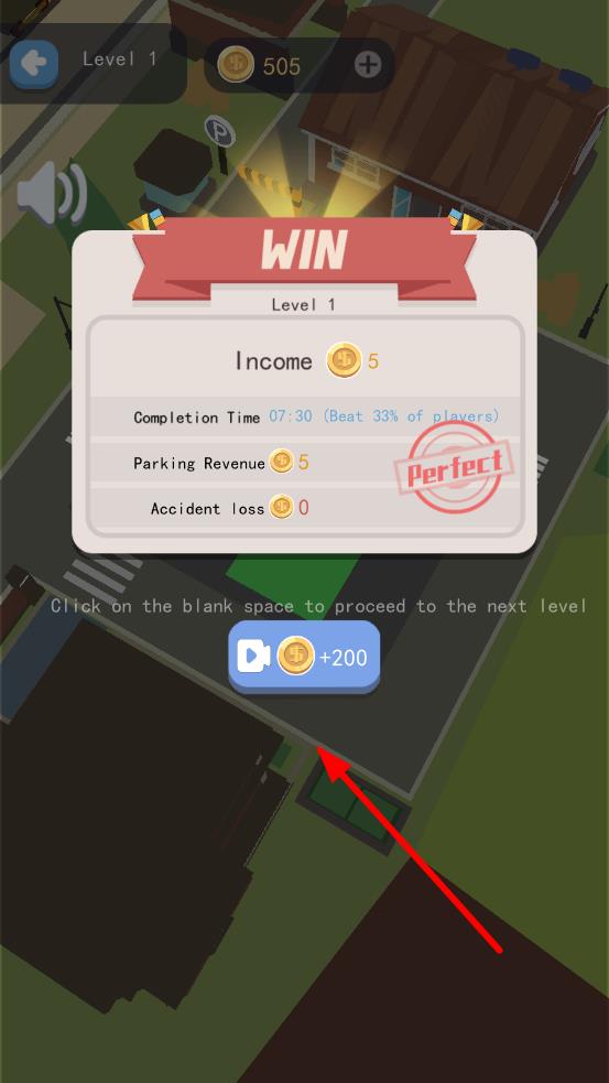 3、成功疏通車輛,界面顯示“WIN”及收益詳情,點擊空白處或?qū)?yīng)按鈕,進入下一關(guān),用積累金幣開辟新停車場或拓寬現(xiàn)有場地。
