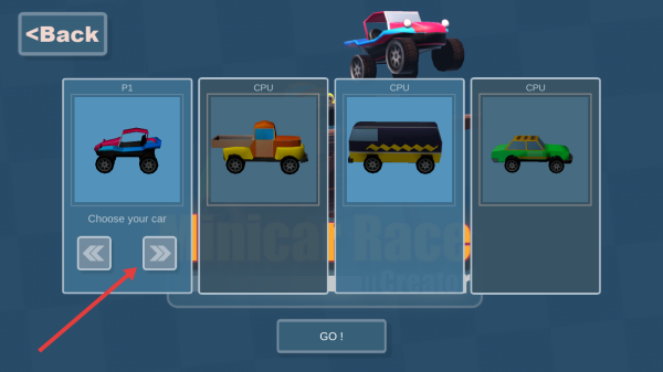 1、在選車界面,用【P1】欄左右箭頭,挑選心儀賽車,確定后點【GO!】進入比賽。