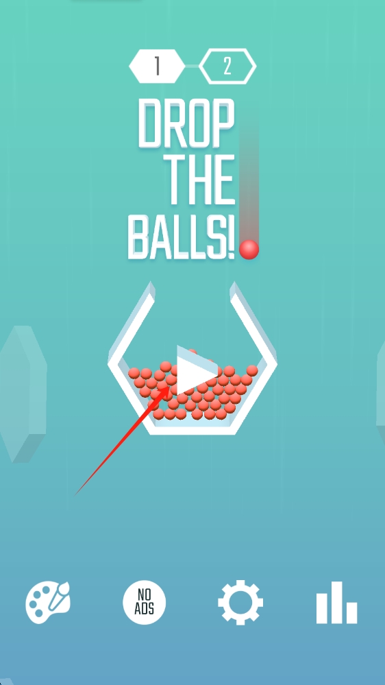 1、游戲啟動界面,標題 “DROP THE BALLS!”,展示紅色小球與容器,有顏色切換、點擊開始游戲。