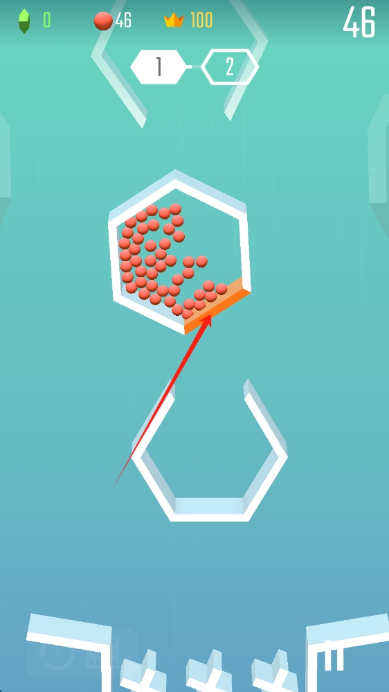 2、游戲關卡(1→2 ),需操作讓紅色小球通過六邊形通道,考驗時機與策略,界面顯示小球數(shù)量(46 )、點擊下落。