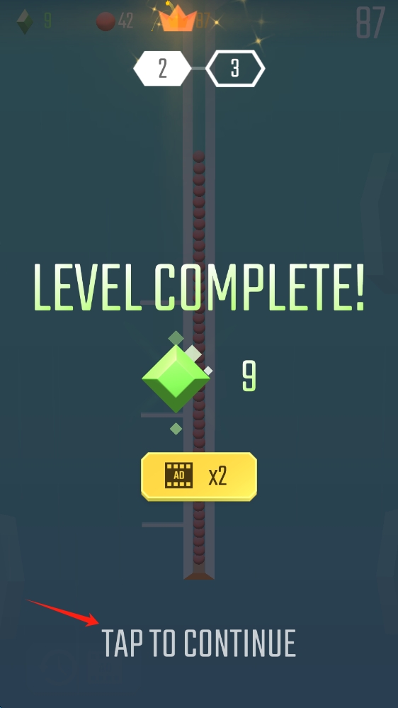 3、關卡完成界面,“LEVEL COMPLETE!”(關卡完成 )提示,獲 9 個綠鉆,點擊繼續(xù)。