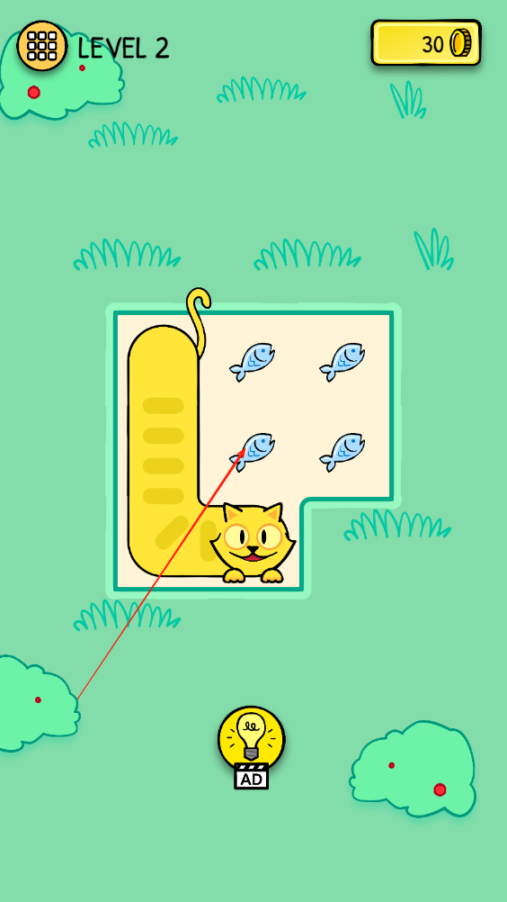 1、選擇關(guān)卡,觀察動(dòng)物位置與食物分布,用手指在屏幕上畫一條線,讓動(dòng)物沿線路移動(dòng),吃掉初始區(qū)域的食物。