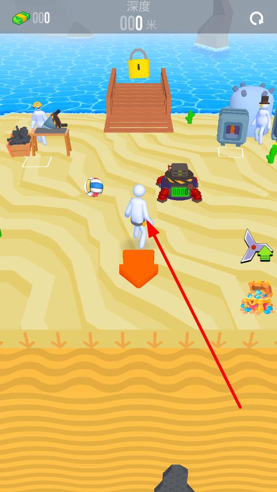 1、進(jìn)入游戲,操控白色小人移動(dòng),靠近挖掘機(jī)區(qū)域開始挖掘,熟悉操作流程,沿箭頭指引深入地下,收集初始資源,開啟挖掘任務(wù)。