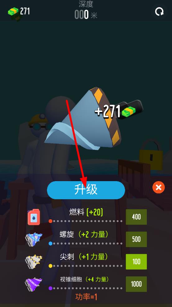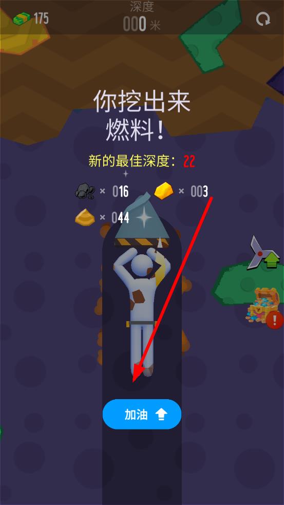 2、可在挖掘中獲取燃料、礦石等資源,達(dá)到深度后彈出結(jié)算界面,點(diǎn)擊“加油”繼續(xù)或返回沙灘,用資源兌換金幣,為改裝挖掘機(jī)攢素材。