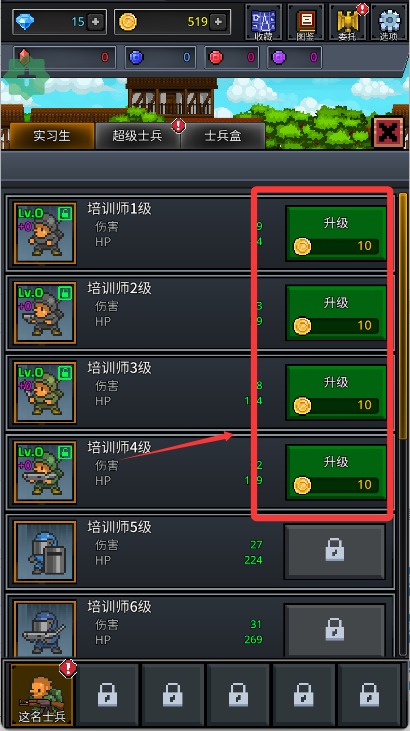4、來(lái)到士兵倉(cāng)庫(kù)可以花費(fèi)金幣升級(jí)士兵的技能。