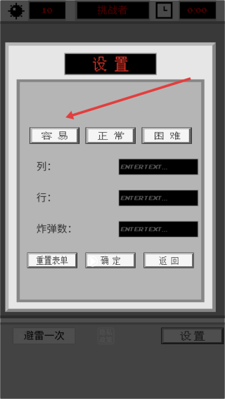 1、進入設置選難度,可先選容易起步按需填行列數(shù)炸彈數(shù),也可默認點確定開啟掃雷棋盤。