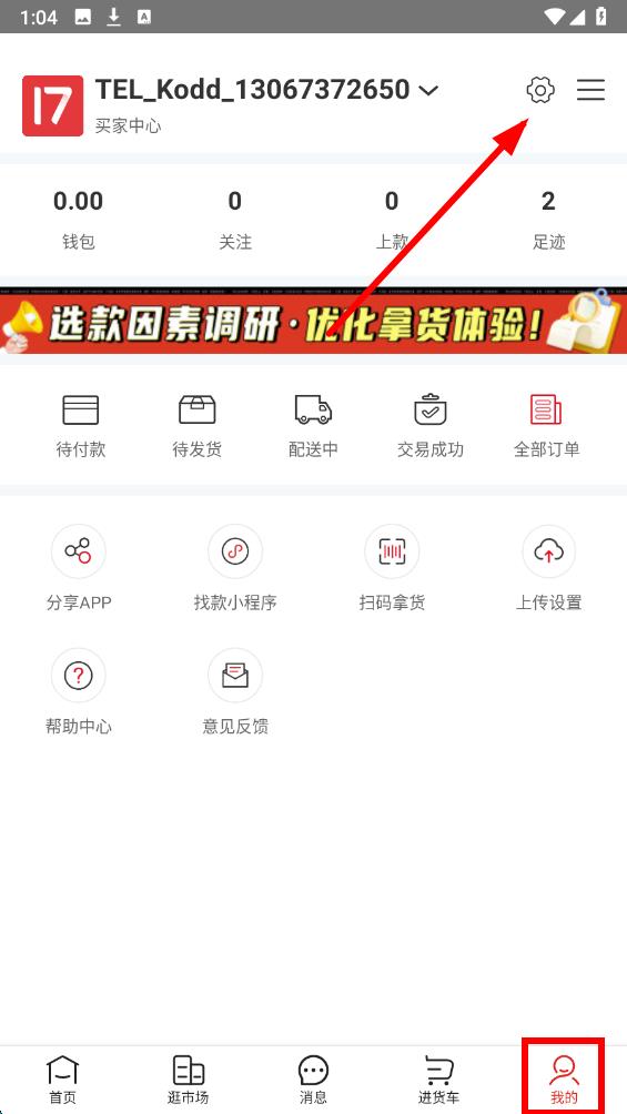 1、打開17貨源APP點擊底部導(dǎo)航欄中的我的選項進入頁面,接著點擊頁面右上角的設(shè)置圖標(biāo)。