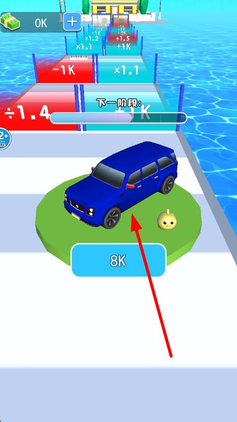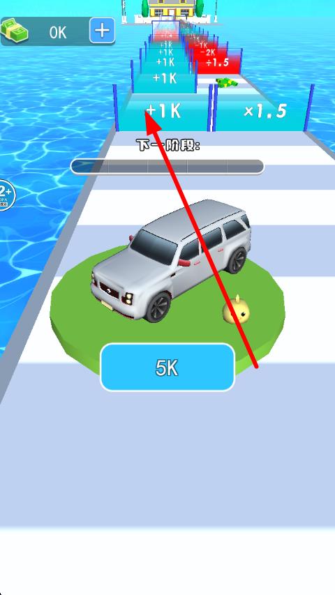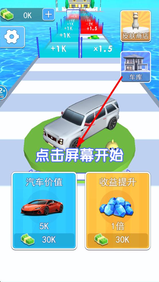 1、點擊醒目的“點擊屏幕開始”按鈕,選定初始汽車型號,仔細觀察賽道上的+1K、×1.5等增益標識分布,通過滑動屏幕靈活控制汽車左右精準移動。
