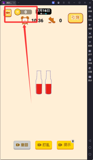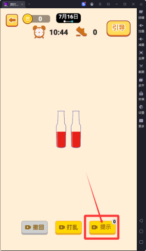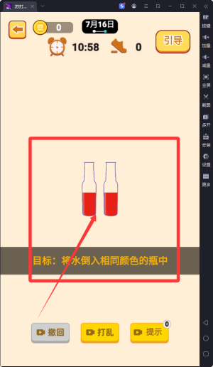 1、基礎傾倒操作,玩家通過點擊水瓶控制液體傾倒方向,將同色液體合并到目標容器中完成關卡目標和要求。
