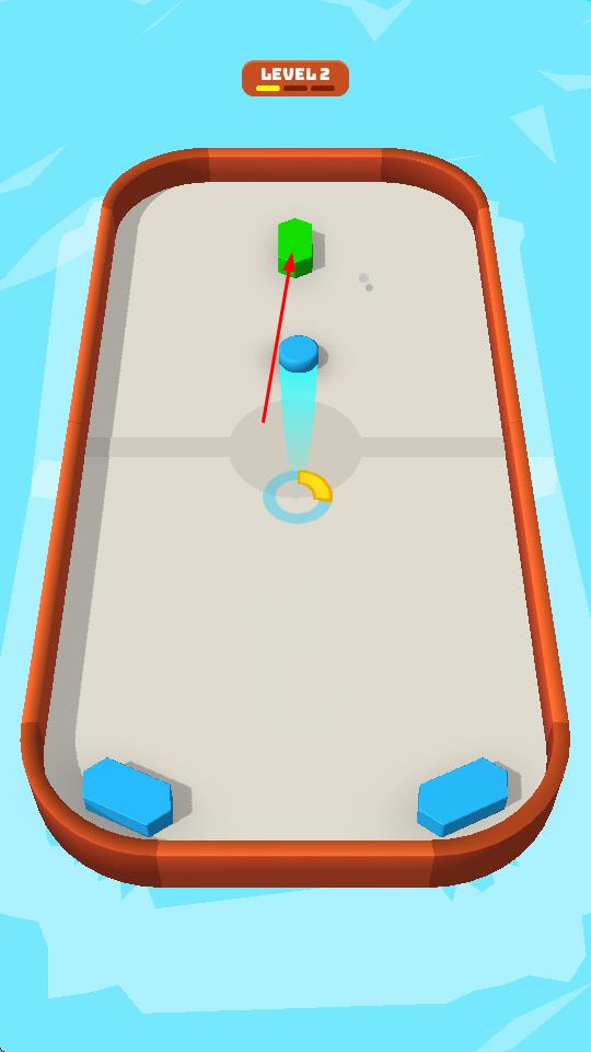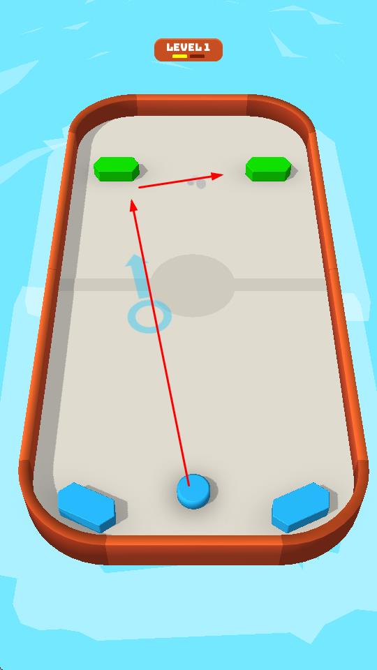 1、進(jìn)入游戲后,在類似空氣曲棍球的場地中,操控藍(lán)色圓盤狀物體,通過滑動(dòng)屏幕等操作,使其在場地內(nèi)移動(dòng),撞擊綠色障礙物。