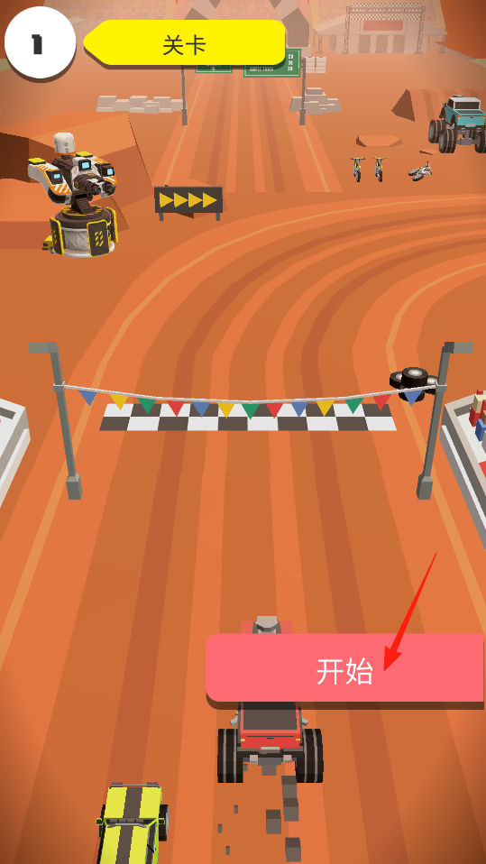 1、進(jìn)入游戲關(guān)卡界面,看到賽道與多輛賽車,點(diǎn)擊開始按鈕,觸發(fā)賽車啟動(dòng),在越野賽道上競(jìng)速,讓賽車駛?cè)胭惖?,為操控賽車跨越障礙爭(zhēng)取勝利做準(zhǔn)備。
