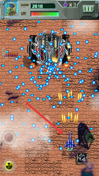 2、BOSS釋放出密集藍(lán)色彈雨時(shí),需要快速調(diào)整戰(zhàn)機(jī)位置,利用彈幕的間隙進(jìn)行穿梭,保障自身的生存。