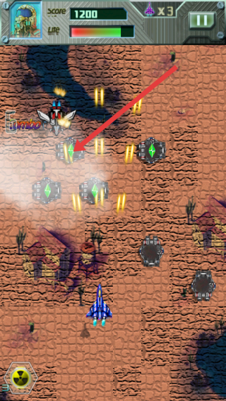 1、戰(zhàn)機(jī)操控方式:通過(guò)手指點(diǎn)擊移動(dòng)屏幕控制戰(zhàn)機(jī),靈活躲避敵軍彈幕與機(jī)體,調(diào)整飛行軌跡以占據(jù)有利位置,為鎖定目標(biāo)并精準(zhǔn)射擊創(chuàng)造條件。