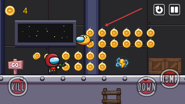 2、進(jìn)入關(guān)卡后沿路線收集金幣,靠近自動拾取,遇障礙,如高臺,按JUMP翻越注意躲避敵方單位。