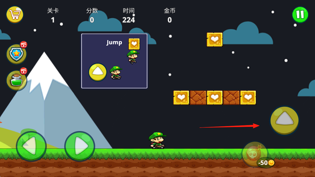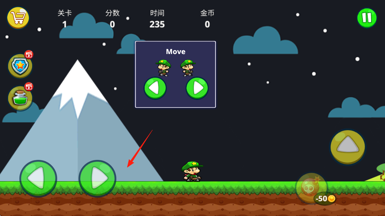 1、用左下綠色箭頭箭頭指向,控制角色左右移動,適應(yīng)操作。
