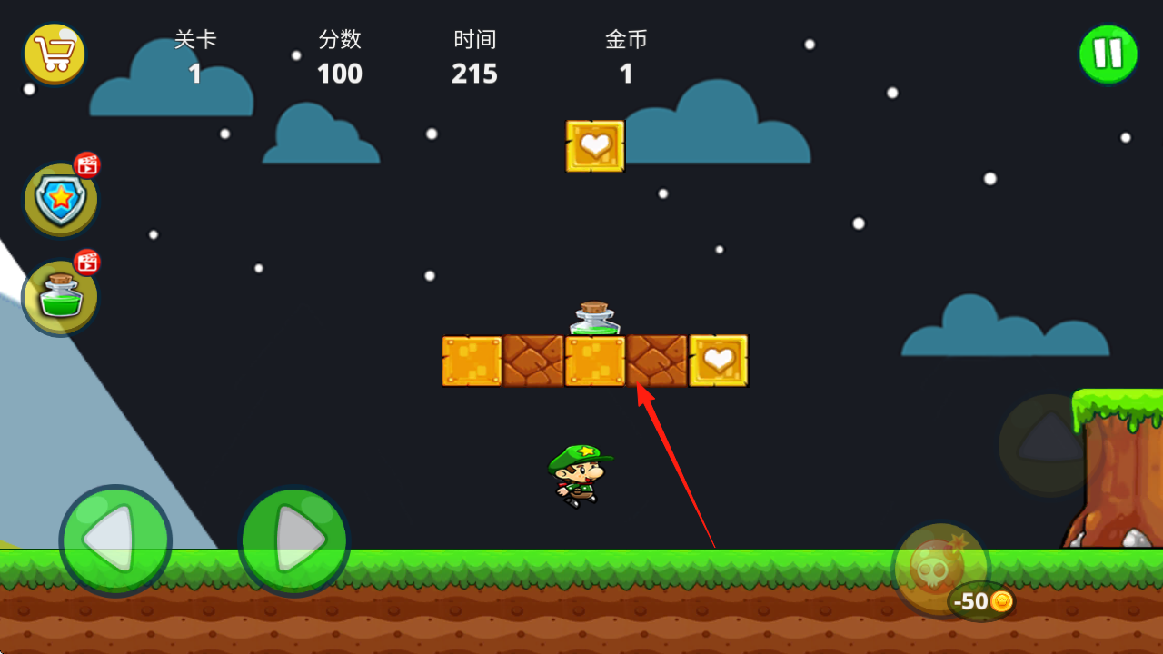 3、沿箭頭,跳上平臺,收集綠色藥水瓶等道具,提升分?jǐn)?shù)、能力,繼續(xù)闖關(guān)。