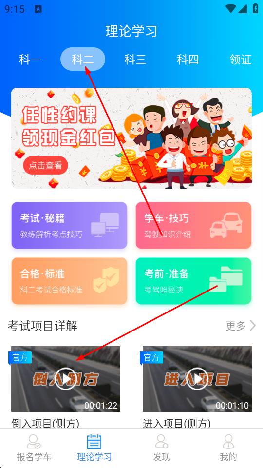 2、在理論學(xué)習(xí)頁面,點擊上方科目分類中的科二,切換到科目二的學(xué)習(xí)界面。