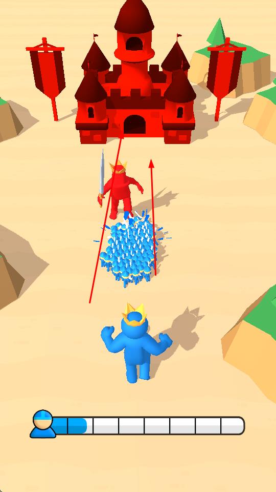 3、隨著游戲推進(jìn),會遇到紅色巨人角色和紅色城堡等目標(biāo),需繼續(xù)壯大己方藍(lán)色小人隊伍,與紅色巨人戰(zhàn)斗并最終攻擊紅色城堡,完成關(guān)卡任務(wù),獲取游戲勝利。