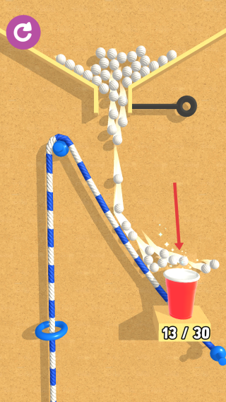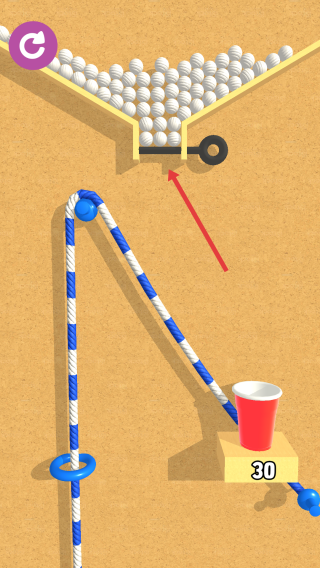 1、規(guī)劃繩子位置:針對被鐵針困住的小球,觀察場景布局,規(guī)劃繩子引入的最佳位置,為小球創(chuàng)造從鐵針到紙杯的合理路徑,是解謎的核心步驟。
