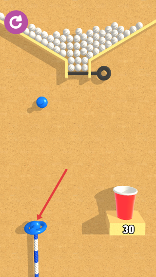 2、點擊上方黑色開關(guān),釋放白色小球,借助繩索引導(dǎo)小球落入紅色杯子。