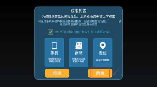 1、首次啟動需閱讀用戶協(xié)議,點擊確認按鈕后進入游戲主界面。