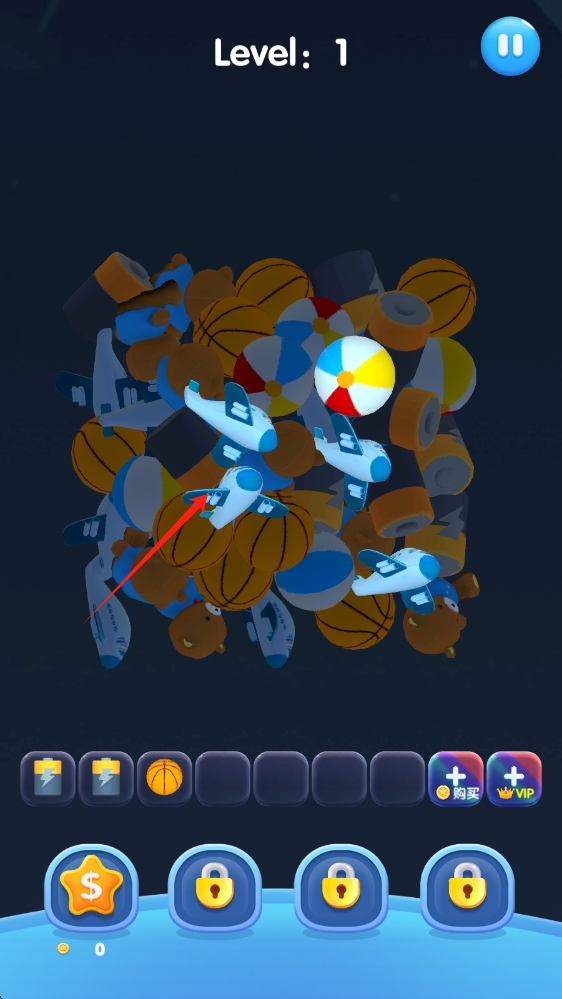 2、觀察堆積玩具,點(diǎn)擊3個及以上相同如藍(lán)色飛機(jī) ,觸發(fā)合并消除,清空區(qū)域,點(diǎn)擊選擇物品。