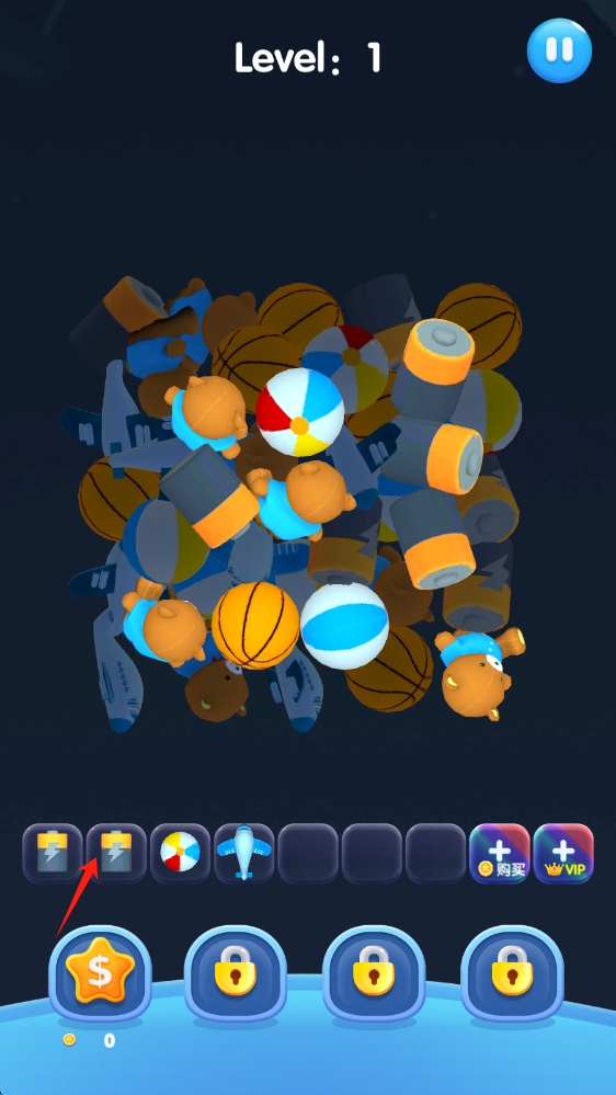3、利用下方道具如閃電 ,快速清理難消除玩具,完成Level 1,解鎖新關(guān)卡與玩具,三個消除相同。