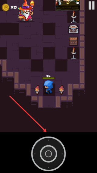 1、通過下方的虛擬搖桿操控角色移動,在像素風(fēng)格的地牢場景中探索,與各類元素互動,推進(jìn)游戲進(jìn)程。