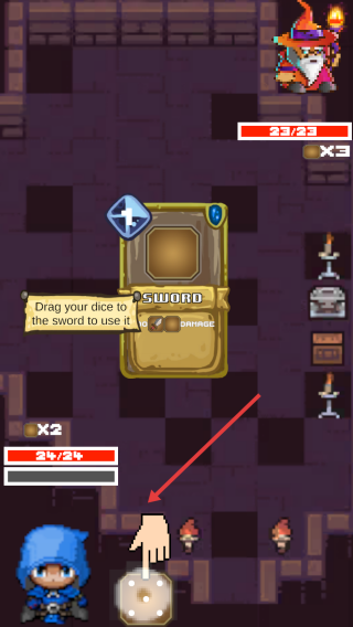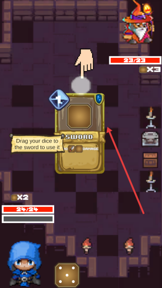 2、根據(jù)提示,將骰子拖動到劍的圖標(biāo)處,使用劍進(jìn)行攻擊,以此與敵人戰(zhàn)斗,提升戰(zhàn)斗能力。