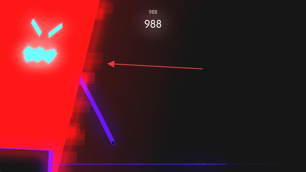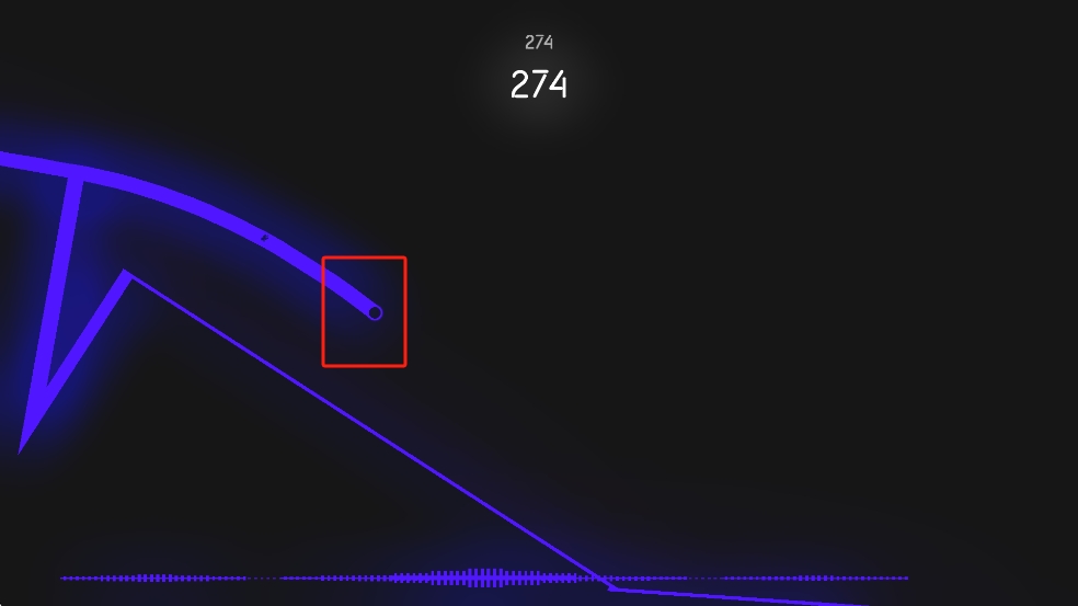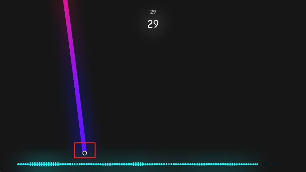 1、操控紅色方框內(nèi)的發(fā)光圓點(diǎn),跟隨底部聲波節(jié)奏移動(dòng),沿紫色軌跡延伸,持續(xù)繪制線條積累分?jǐn)?shù)。