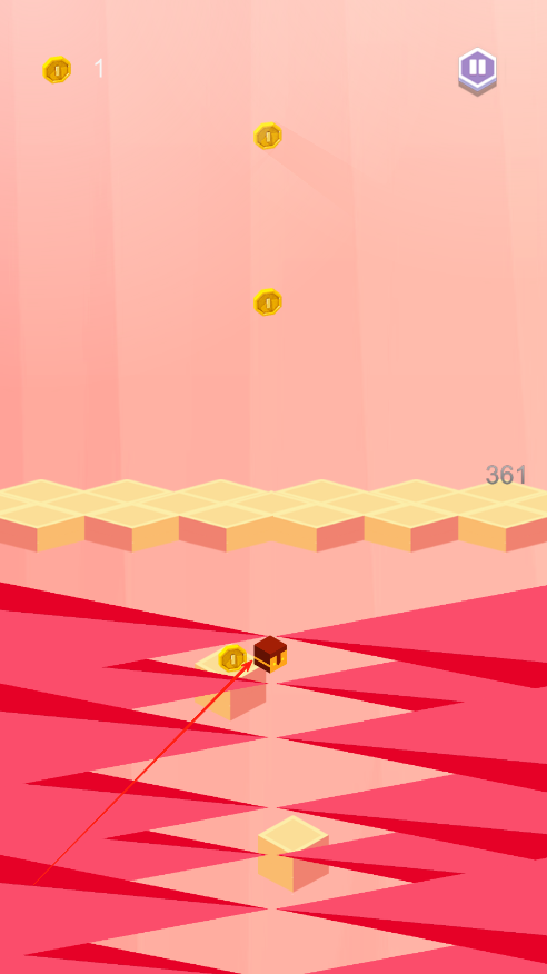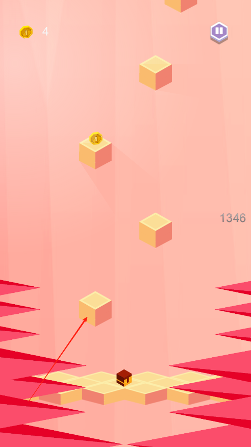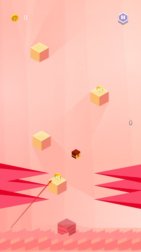 3、游戲是無限模式,爬得越高,記錄越高,向上跳躍的過程中注意收集金幣,金幣可以在賽后購買小方塊皮膚。