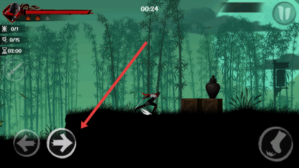 3、進入竹林關卡,點擊右側方向箭頭按鈕,操控忍者角色向右移動,探索場景并完成任務。