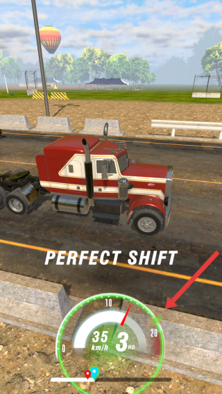 1、在駕駛紅色的卡車時,需要觀察下方轉(zhuǎn)速表,待指針進入綠色區(qū)域,觸發(fā)PERFECT SHIFT,把握時機換擋。