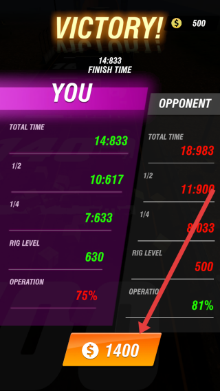 3、在比賽結(jié)束后,需要點擊橙色$1400的按鈕,領(lǐng)取金幣的獎勵,可以用于自己卡車升級性能。