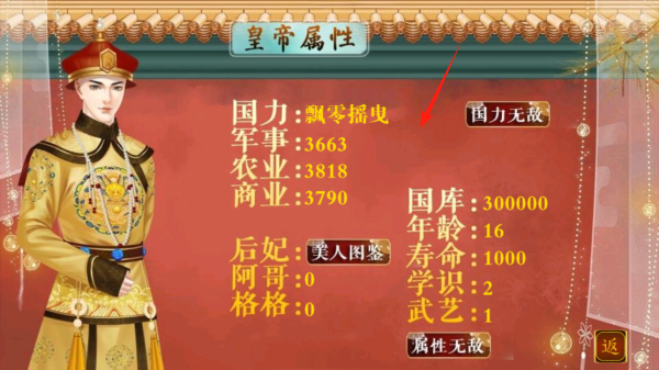 2、進(jìn)入皇帝屬性界面,查看國(guó)力、軍事等數(shù)值,通過(guò)提升不同屬性,影響國(guó)家發(fā)展,點(diǎn)擊屬性區(qū)域,可進(jìn)行相關(guān)操作,體驗(yàn)數(shù)值經(jīng)營(yíng)機(jī)制。