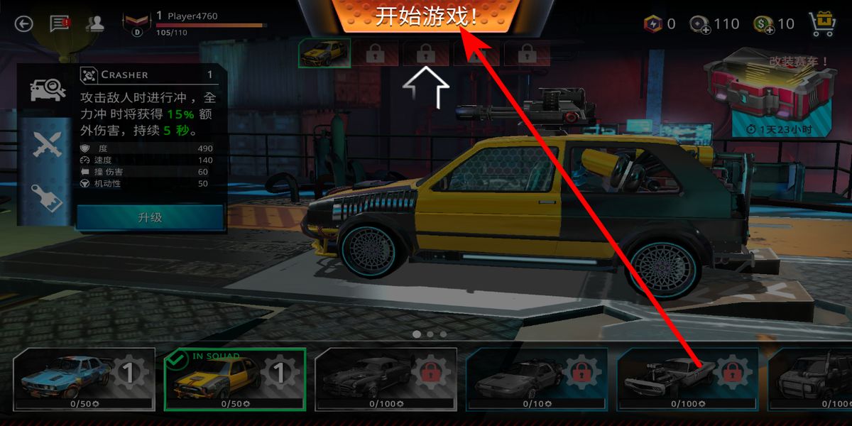 1、打開游戲后,界面上方的開始游戲按鈕,點(diǎn)擊該按鈕,即可進(jìn)入匹配隊(duì)列,等待系統(tǒng)為你匹配其他玩家開始對戰(zhàn),匹配成功后,駕駛車輛與其他玩家展開戰(zhàn)斗。