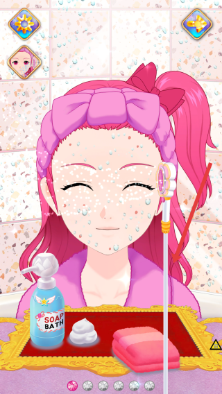 3、在抹完潔面乳時(shí),點(diǎn)擊沖水頭把臉上的潔面乳清洗干凈,并用旁邊的毛巾將角色的臉擦干凈。