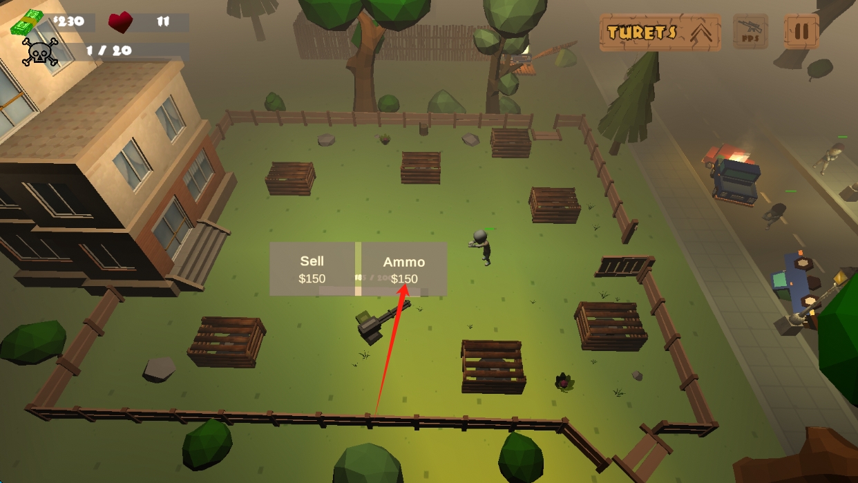 3、在塔防場景中,根據(jù)箭頭提示,點擊Ammo,花費150美元購買彈藥,提升防御能力,點擊升級。