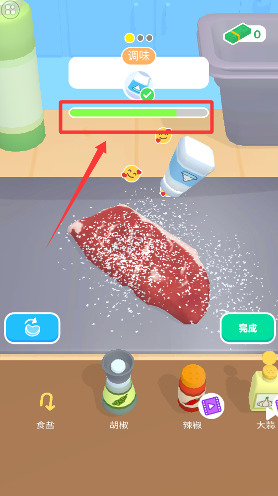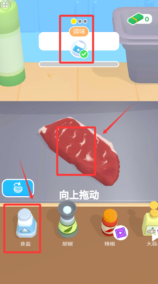 2、先把牛排調(diào)味,移動(dòng)下面的鹽撒再牛排上。