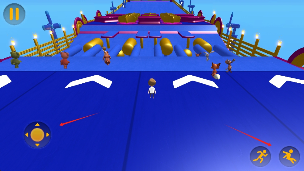 1、操控左側(cè)虛擬搖桿移動(dòng)角色,點(diǎn)擊右側(cè)奔跑按鈕加速,開局快速搶占位置,留意前方對(duì)手與場(chǎng)景障礙。
