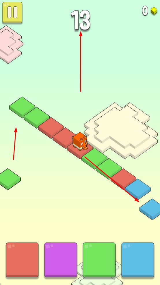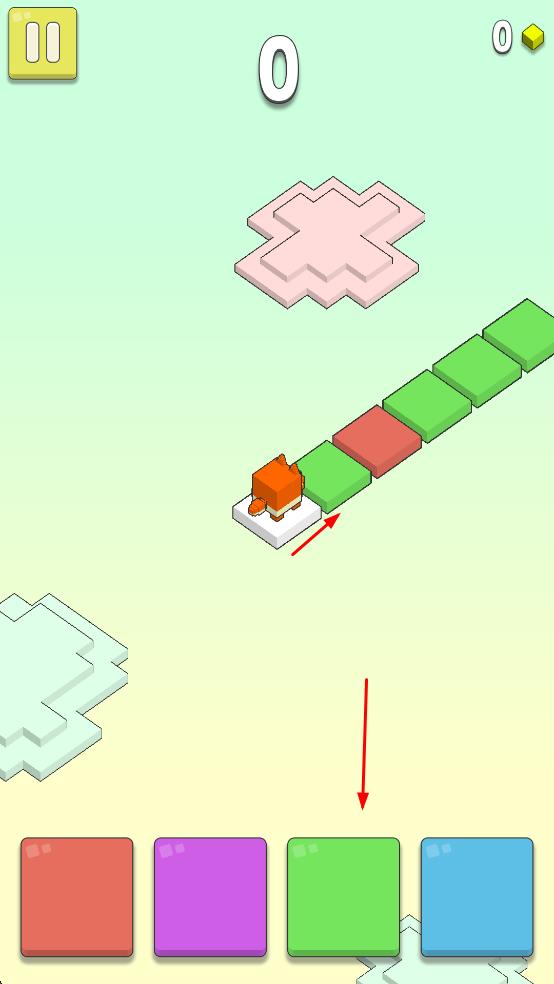 1、色彩匹配控制前進(jìn):道路由不同顏色方塊組成,玩家需點(diǎn)擊屏幕下方對(duì)應(yīng)顏色的按鈕控制小動(dòng)物前行,只有按鈕顏色與道路方塊一致才能前進(jìn),錯(cuò)誤則會(huì)跌落失敗。