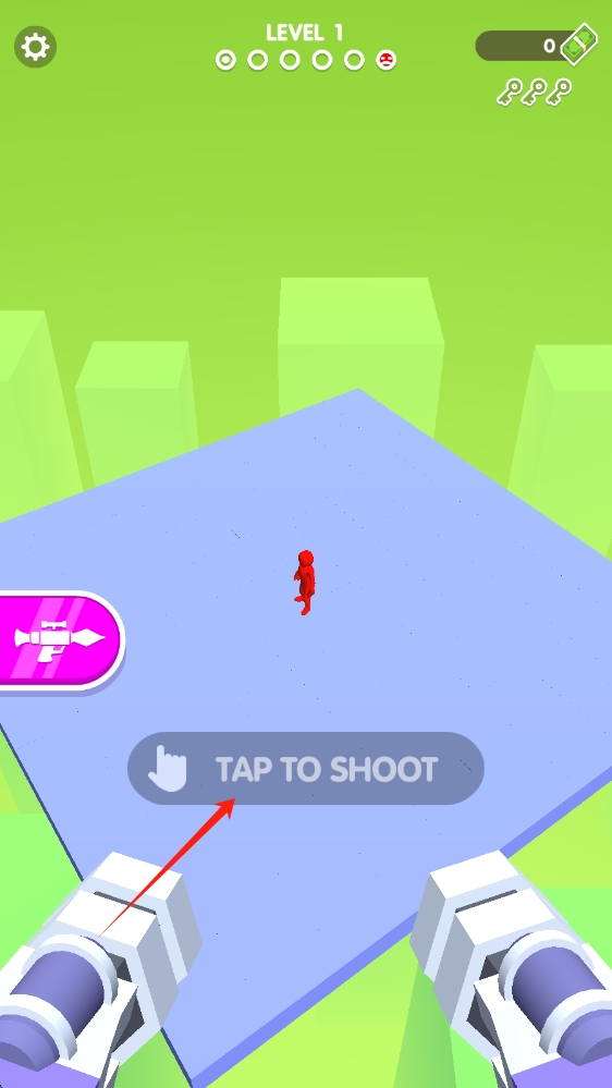 1、在游戲啟動(dòng)界面,跟隨箭頭提示,點(diǎn)擊TAPTOSHOOT,開(kāi)啟射擊冒險(xiǎn),進(jìn)入游戲世界。