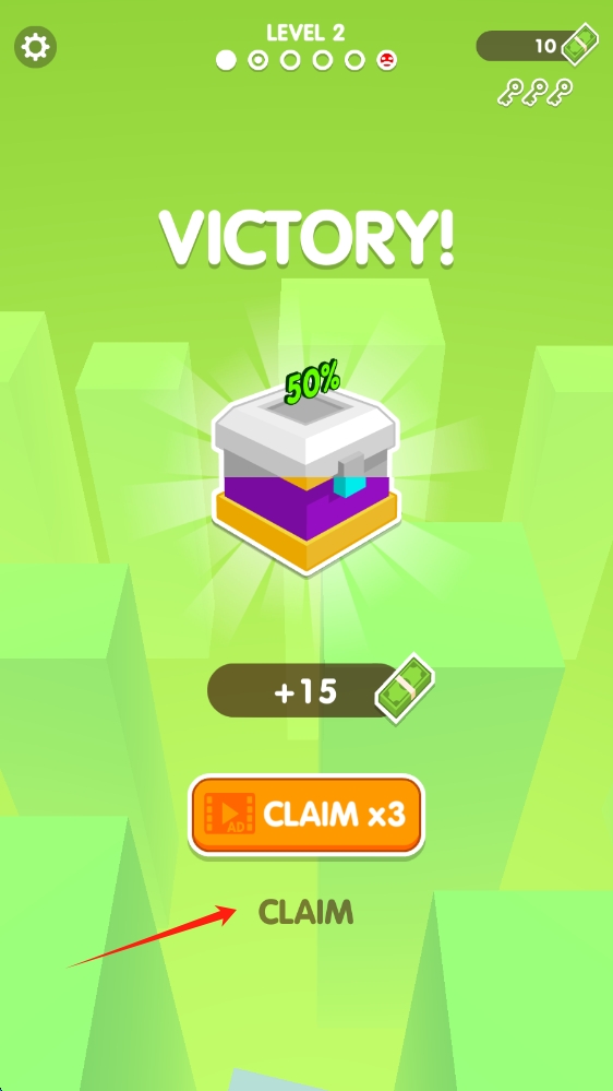 3、在游戲勝利界面,根據(jù)箭頭提示,點(diǎn)擊CLAIM,領(lǐng)取獎(jiǎng)勵(lì),繼續(xù)挑戰(zhàn)下一關(guān),探索更多游戲內(nèi)容,推進(jìn)游戲進(jìn)度。