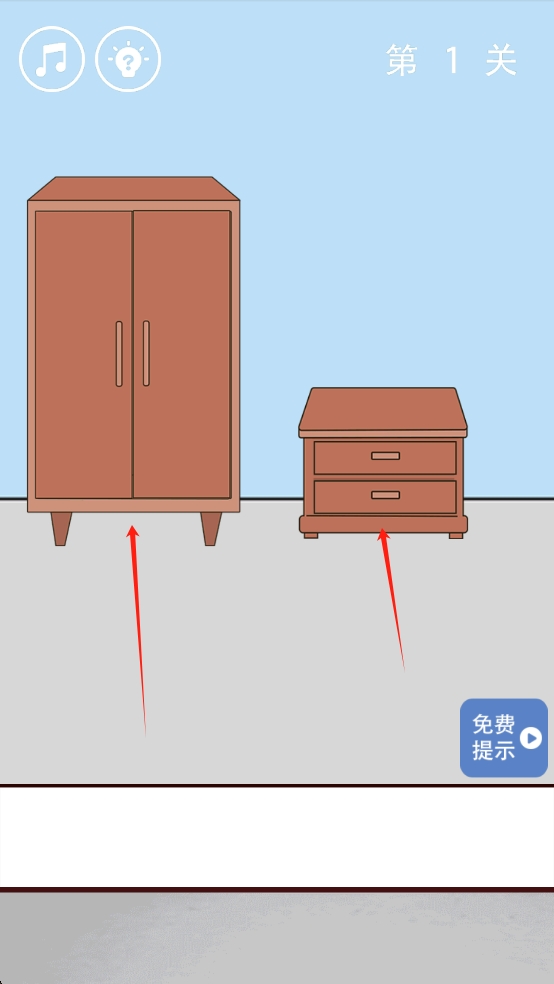 1、進(jìn)入第1關(guān),觀察場景有衣柜和床頭柜,根據(jù)箭頭指引,先點擊打開衣柜與床頭柜,尋找關(guān)鍵物品。